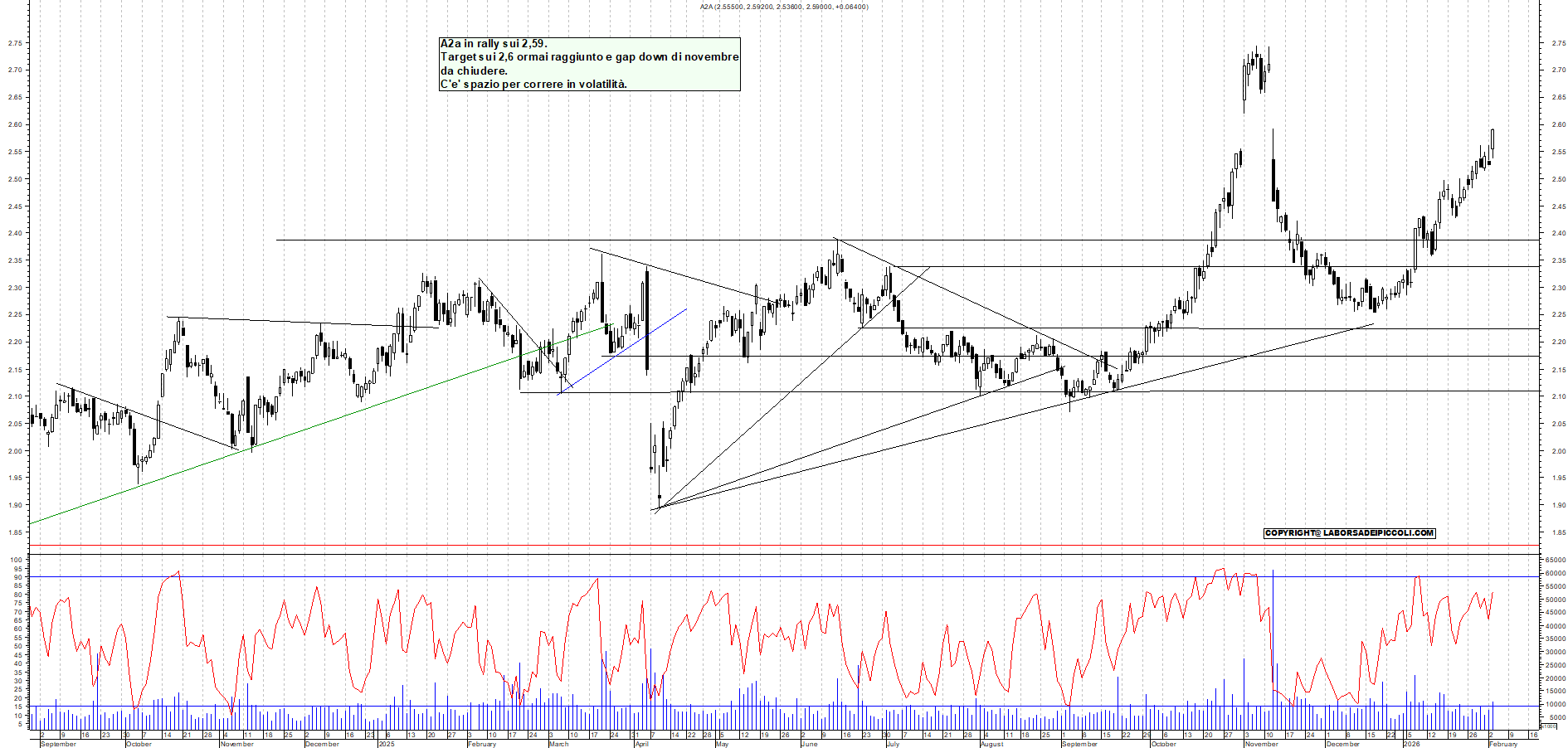 A2A: A2a in rally sui 2,59. Target sui 2,6 ormai raggiunto e gap down di novembre da chiudere. C'e' spazio per correre in volatilità.