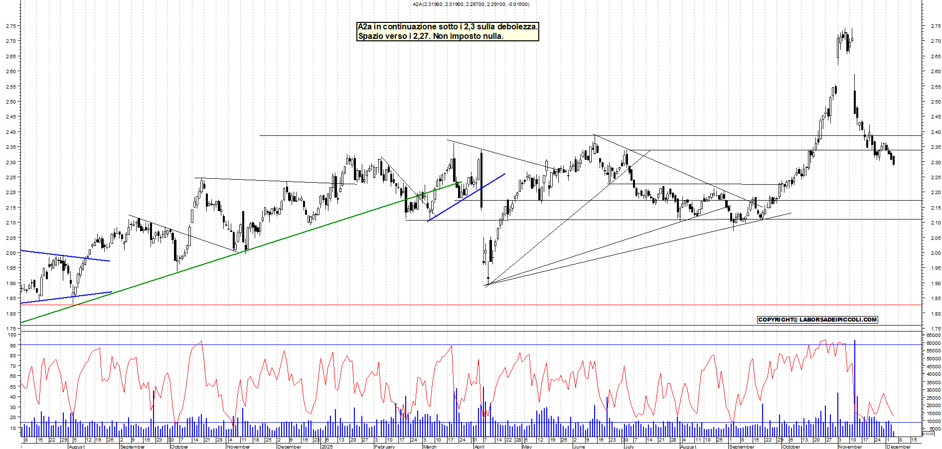 A2A: A2a in continuazione sotto i 2,3 sulla debolezza. Spazio verso i 2,27. Non imposto nulla.