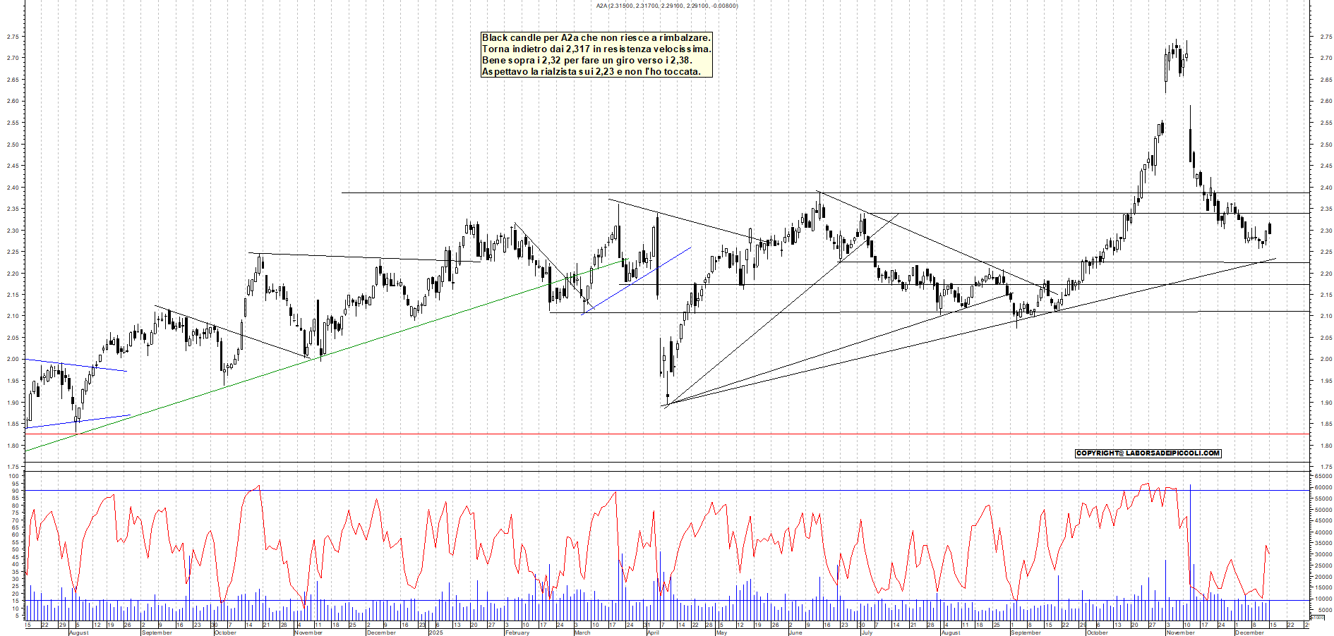 A2A: Black candle per A2a che non riesce a rimbalzare. Torna indietro dai 2,317 in resistenza velocissima. Bene sopra i 2,32 per fare un giro verso i 2,38. Aspettavo la rialzista sui 2,23 e non l'ho toccata.