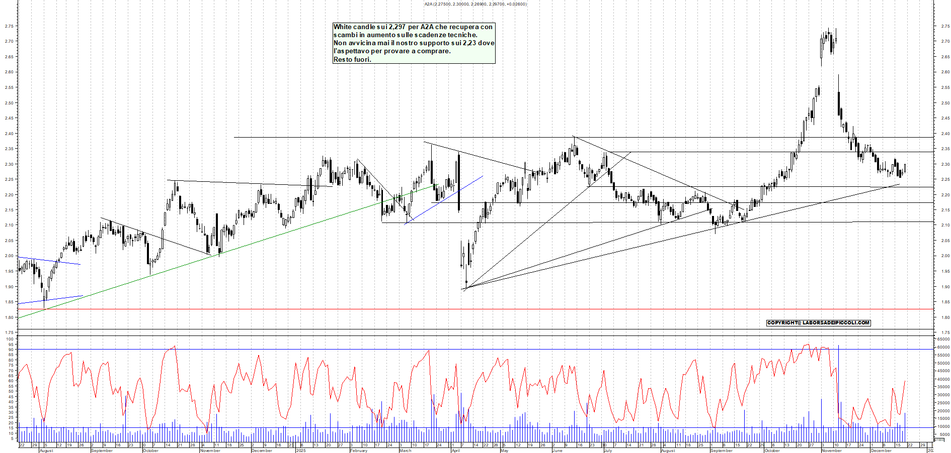 A2A: White candle sui 2,297 per A2A che recupera con scambi in aumento sulle scadenze tecniche. Non avvicina mai il nostro supporto sui 2,23 dove l'aspettavo per provare a comprare. Resto fuori.
