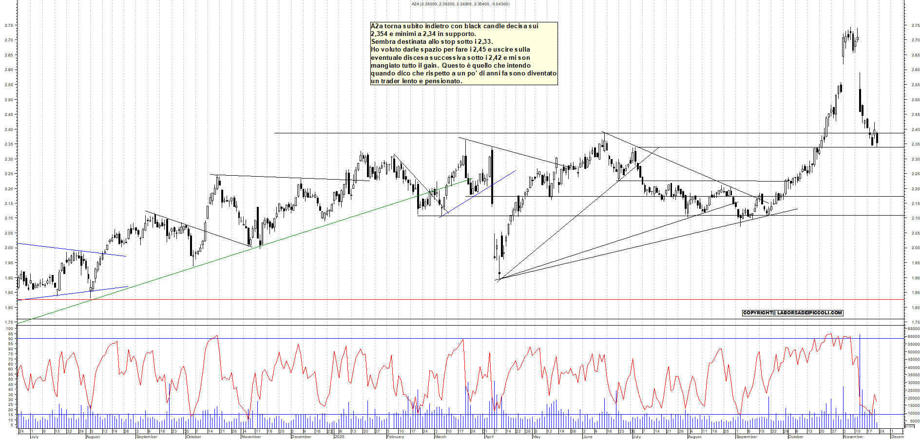 A2A: A2a torna subito indietro con black candle decisa sui 2,354 e minimi a 2,34 in supporto. Sembra destinata allo stop sotto i 2,33. Ho voluto darle spazio per fare i 2,45 e uscire sulla eventuale discesa successiva sotto i 2,42 e mi son mangiato tutto il gain. Questo è quello che intendo quando dico che rispetto a un po' di anni fa sono diventato un trader lento e pensionato.