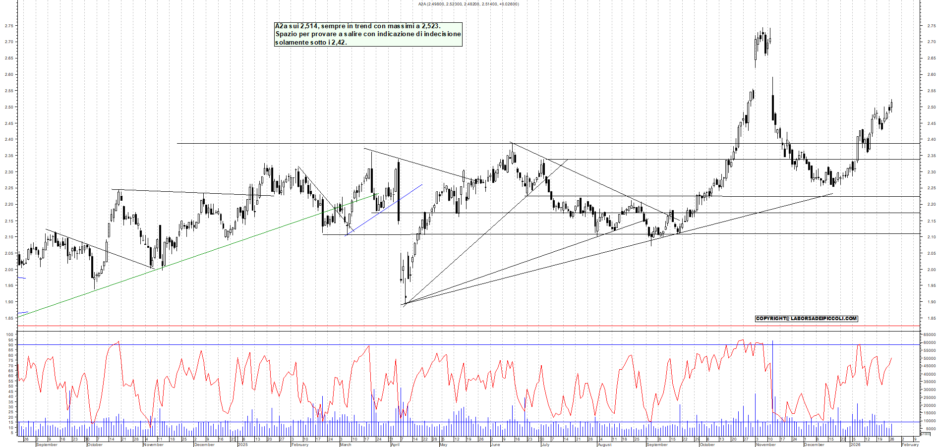 A2A: A2a sui 2,514, sempre in trend con massimi a 2,523. Spazio per provare a salire con indicazione di indecisione solamente sotto i 2,42.