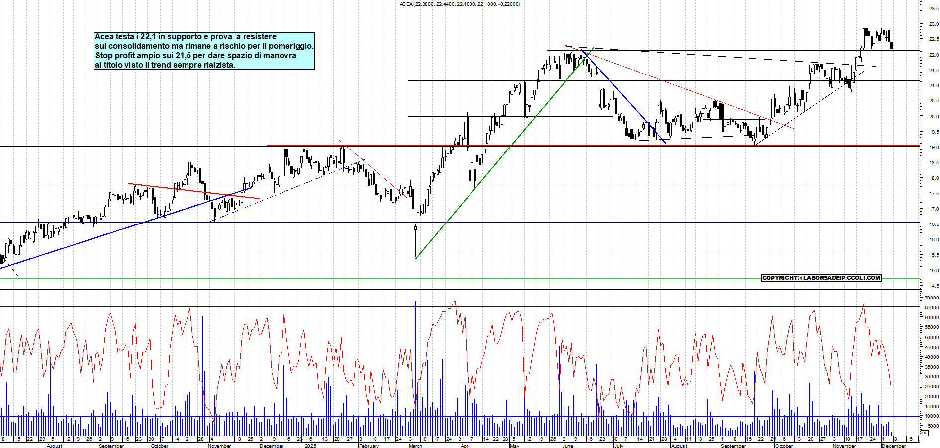 ACEA: Acea testa i 22,1 in supporto e prova a resistere sul consolidamento ma rimane a rischio per il pomeriggio. Stop profit ampio sui 21,5 per dare spazio di manovra al titolo visto il trend sempre rialzista.