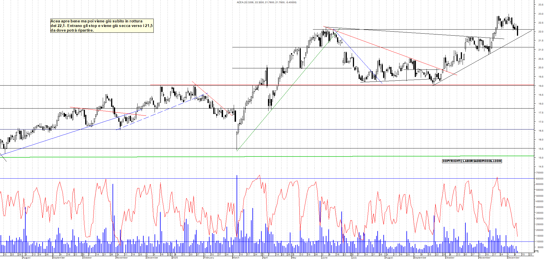 ACEA: Acea apre bene ma poi viene giù subito in rottura dei 22,1- Entrano gli stop e viene giù secca verso i 21,5 da dove potrà ripartire.