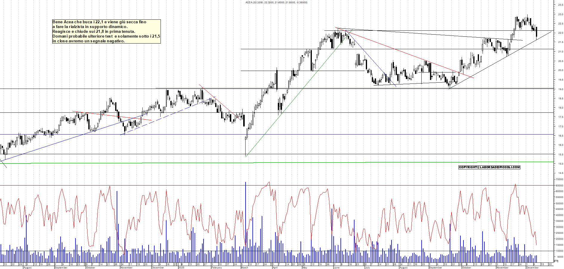 ACEA: Bene Acea che buca i 22,1 e viene giù secca fino a fare la rialzista in supporto dinamico. Reagisce e chiude sui 21,8 in prima tenuta. Domani probabile ulteriore test e solamente sotto i 21,5 in close avremo un segnale negativo.
