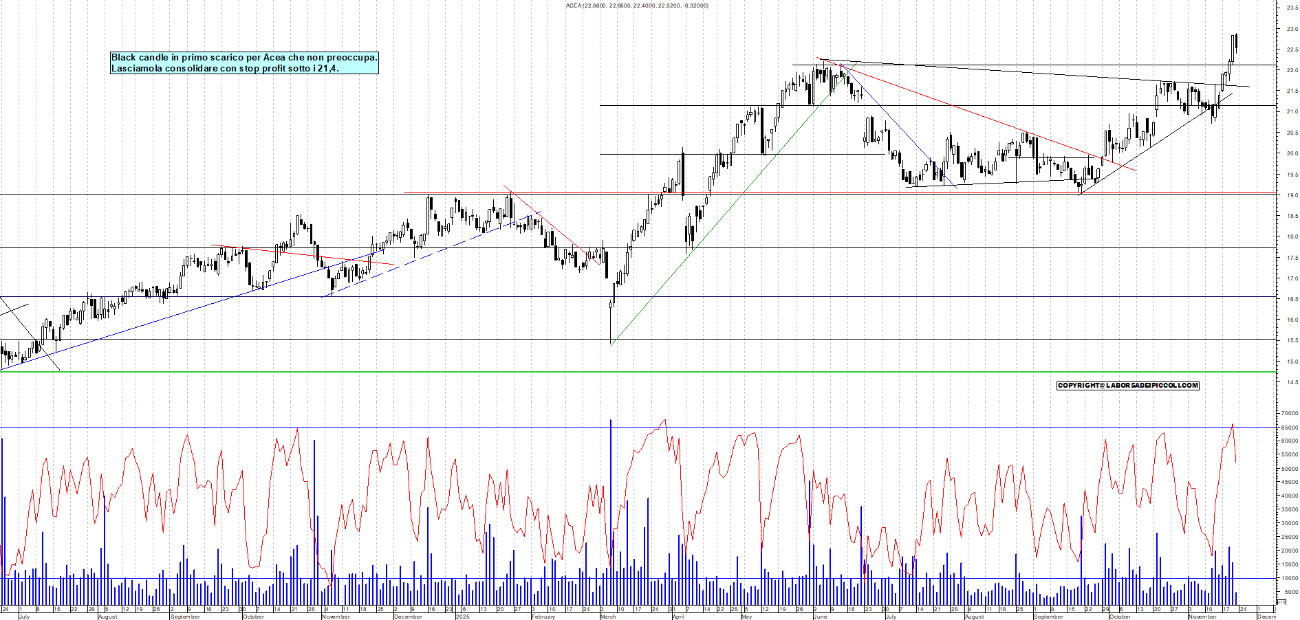 ACEA: Black candle in primo scarico per Acea che non preoccupa. Lasciamola consolidare con stop profit sotto i 21,4.