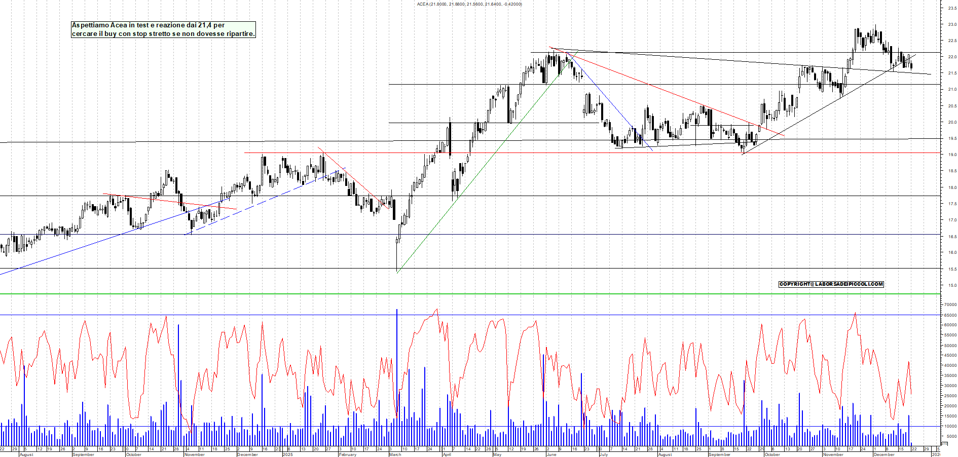 ACEA: Aspettiamo Acea in test e reazione dai 21,4 per cercare il buy con stop stretto se non dovesse ripartire.