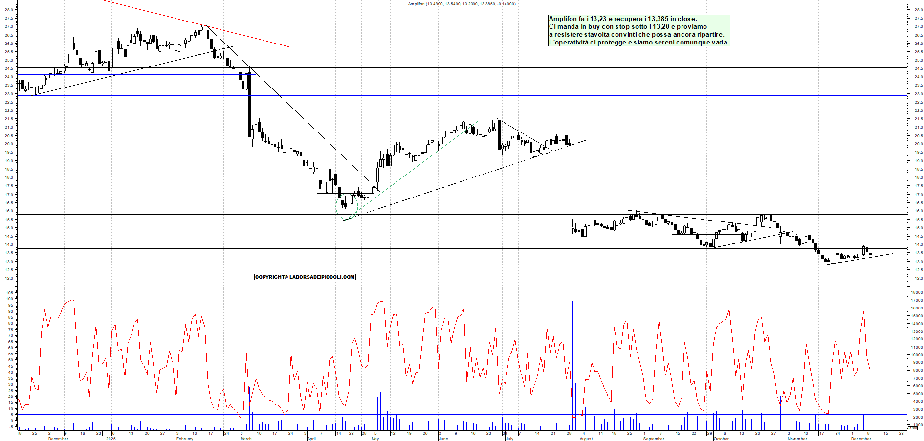AMPLIFON: Amplifon fa i 13,23 e recupera i 13,385 in close. Ci manda in buy con stop sotto i 13,20 e proviamo a resistere stavolta convinti che possa ancora ripartire. L'operatività ci protegge e siamo sereni comunque vada.