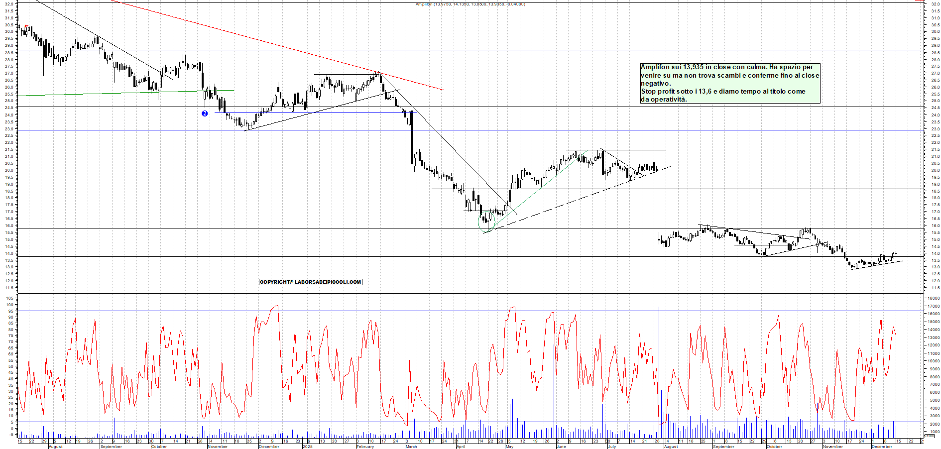 AMPLIFON: Amplifon sui 13,935 in close con calma. Ha spazio per venire su ma non trova scambi e conferme fino al close negativo. Stop profit sotto i 13,6 e diamo tempo al titolo come da operatività.