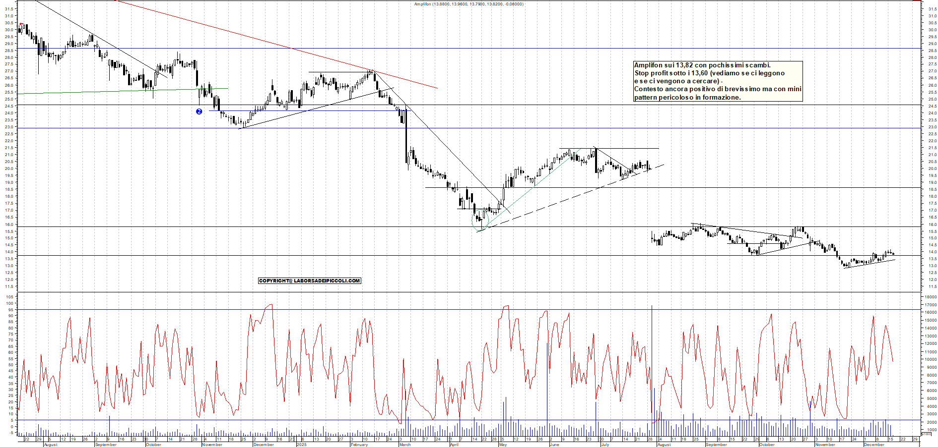 AMPLIFON: Amplifon sui 13,82 con pochissimi scambi. Stop profit sotto i 13,60 (vediamo se ci leggono e se ci vengono a cercare) - Contesto ancora positivo di brevissimo ma con mini pattern pericoloso in formazione.