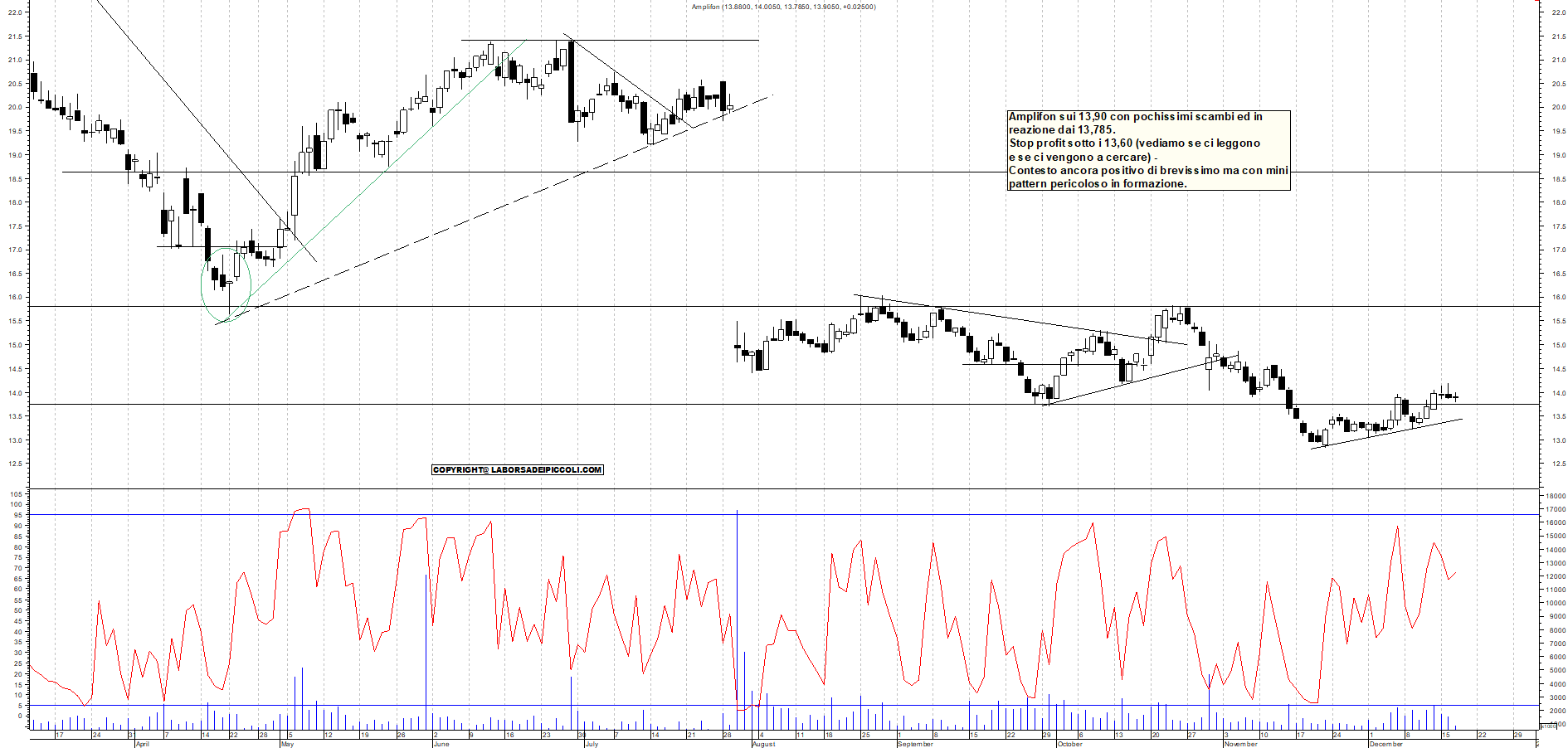 AMPLIFON: Amplifon sui 13,90 con pochissimi scambi ed in reazione dai 13,785. Stop profit sotto i 13,60 (vediamo se ci leggono e se ci vengono a cercare) - Contesto ancora positivo di brevissimo ma con mini pattern pericoloso in formazione.