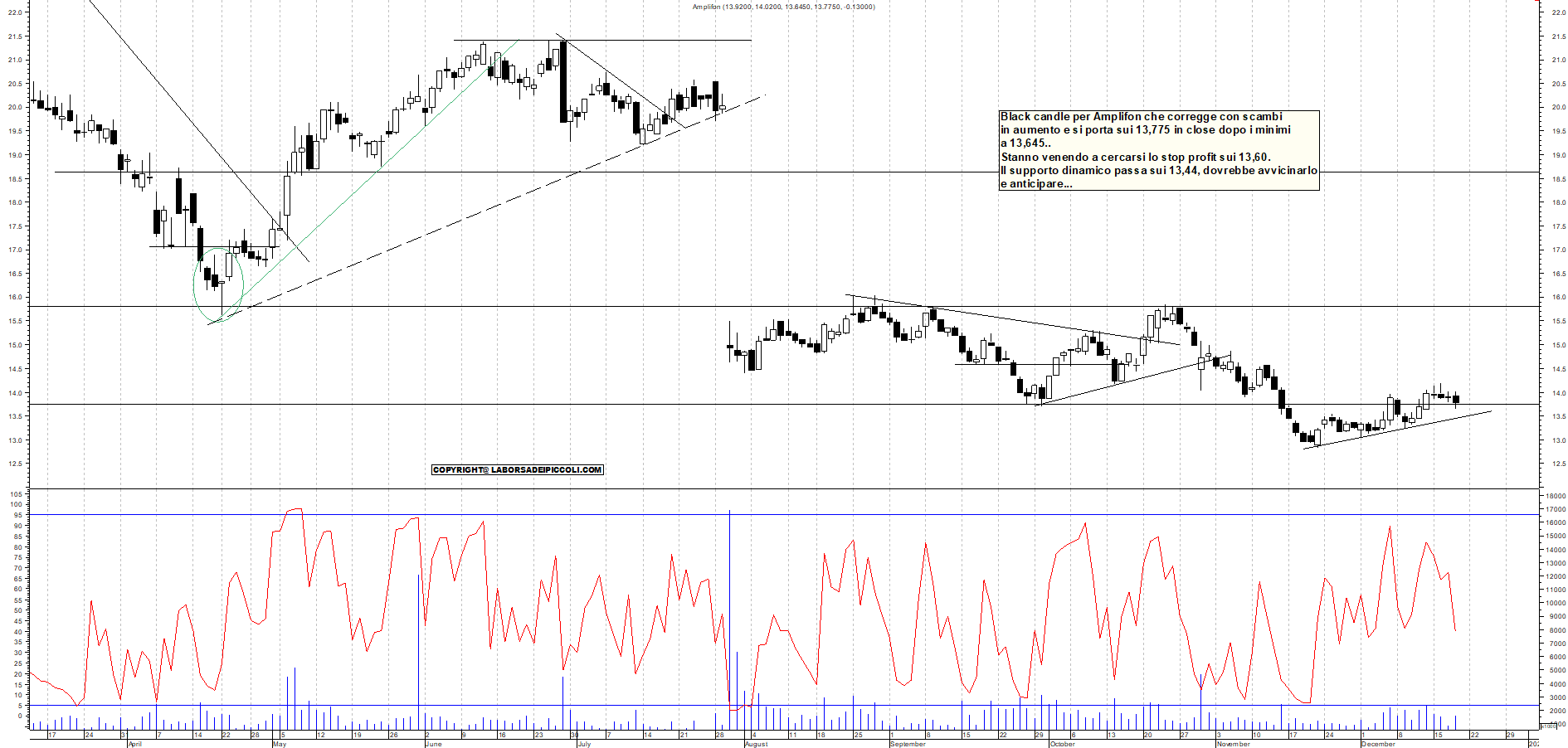 AMPLIFON: Black candle per Amplifon che corregge con scambi in aumento e si porta sui 13,775 in close dopo i minimi a 13,645.. Stanno venendo a cercarsi lo stop profit sui 13,60. Il supporto dinamico passa sui 13,44, dovrebbe avvicinarlo e anticipare...