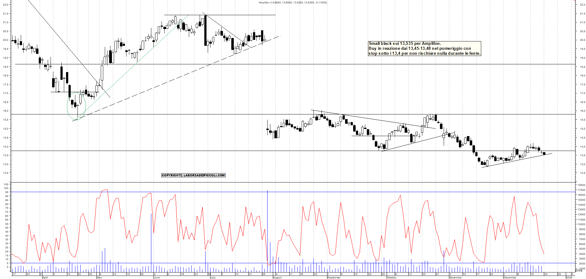 AMPLIFON: Small black sui 13,535 per Amplifon. Buy in reazione dai 13,45-13,48 nel pomeriggio con stop sotto i 13,4 per non rischiare nulla durante le feste.