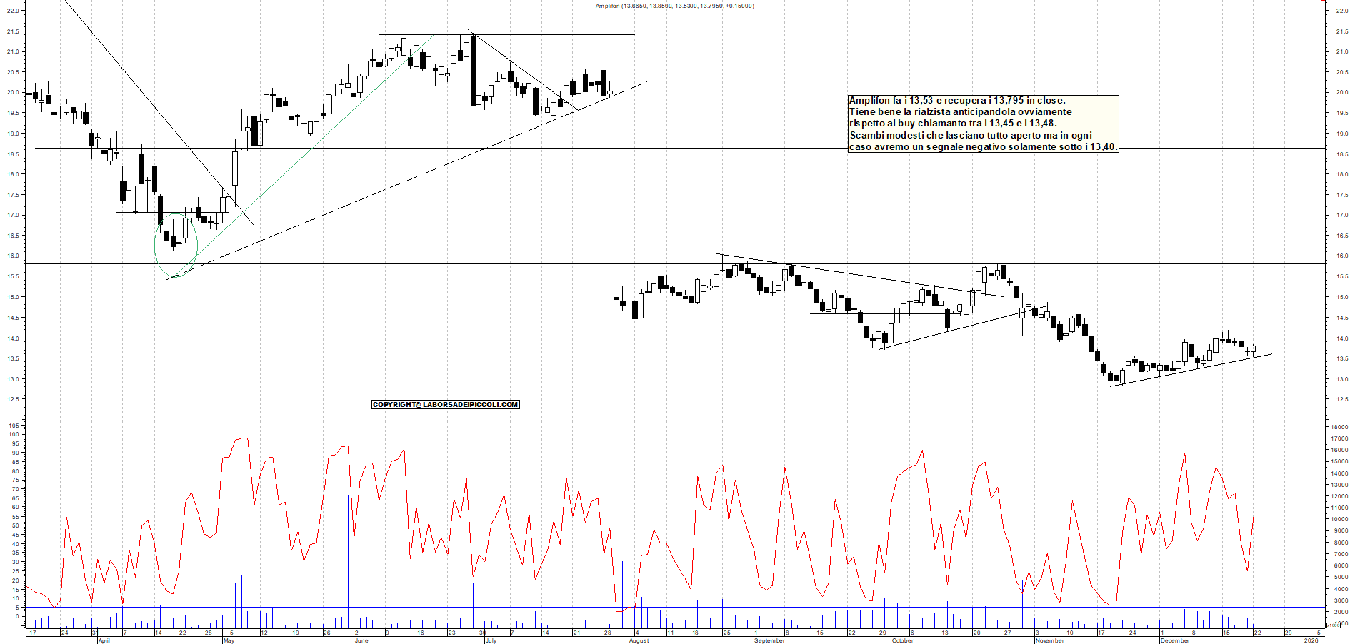 AMPLIFON: Amplifon fa i 13,53 e recupera i 13,795 in close. Tiene bene la rialzista anticipandola ovviamente rispetto al buy chiamanto tra i 13,45 e i 13,48. Scambi modesti che lasciano tutto aperto ma in ogni caso avremo un segnale negativo solamente sotto i 13,40.