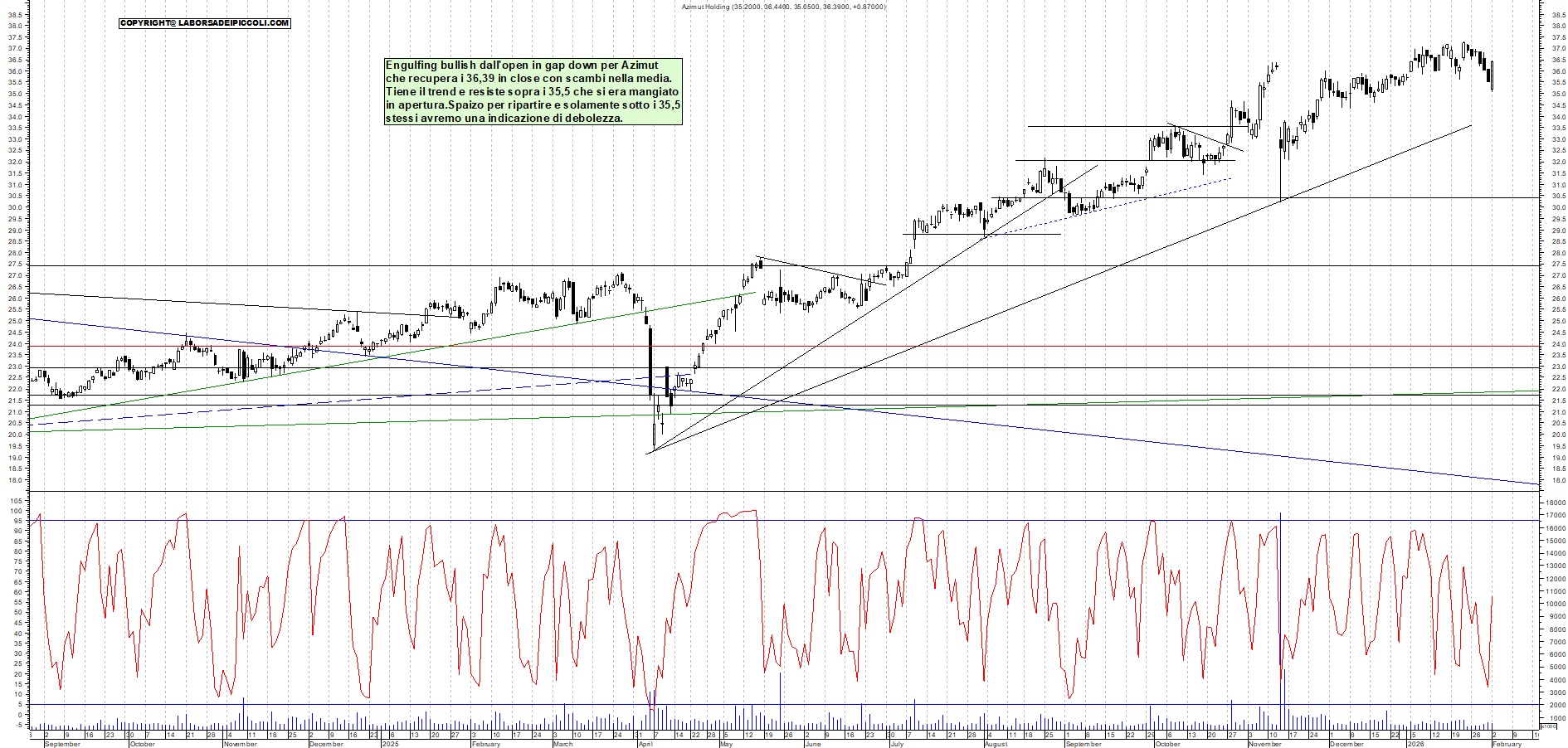 AZIMUT: Engulfing bullish dall'open in gap down per Azimut che recupera i 36,39 in close con scambi nella media. Tiene il trend e resiste sopra i 35,5 che si era mangiato in apertura.Spaizo per ripartire e solamente sotto i 35,5 stessi avremo una indicazione di debolezza.