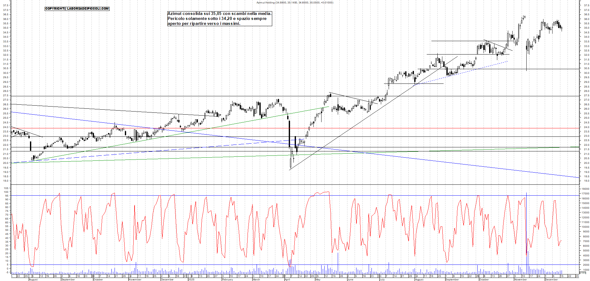 AZIMUT: Azimut consolida sui 35,05 con scambi nella media. Pericolo solamente sotto i 34,20 e spazio sempre aperto per ripartire verso i massimi.
