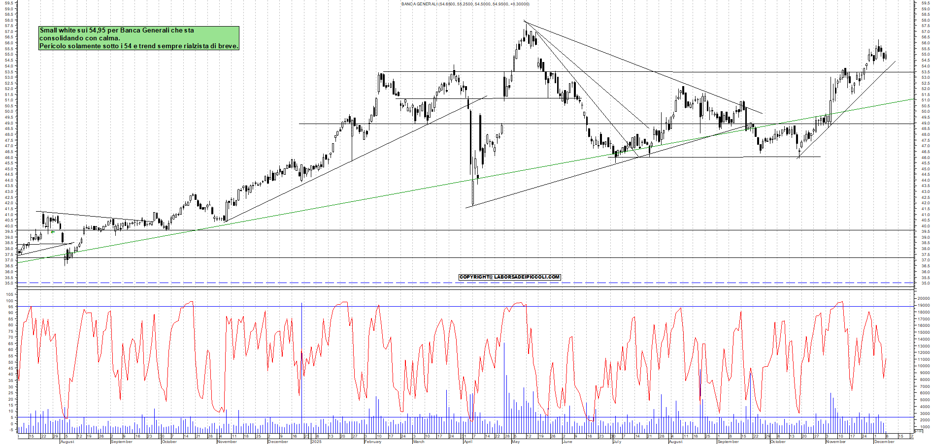 BANCA-GENERALI: Small white sui 54,95 per Banca Generali che sta consolidando con calma. Pericolo solamente sotto i 54 e trend sempre rialzista di breve.
