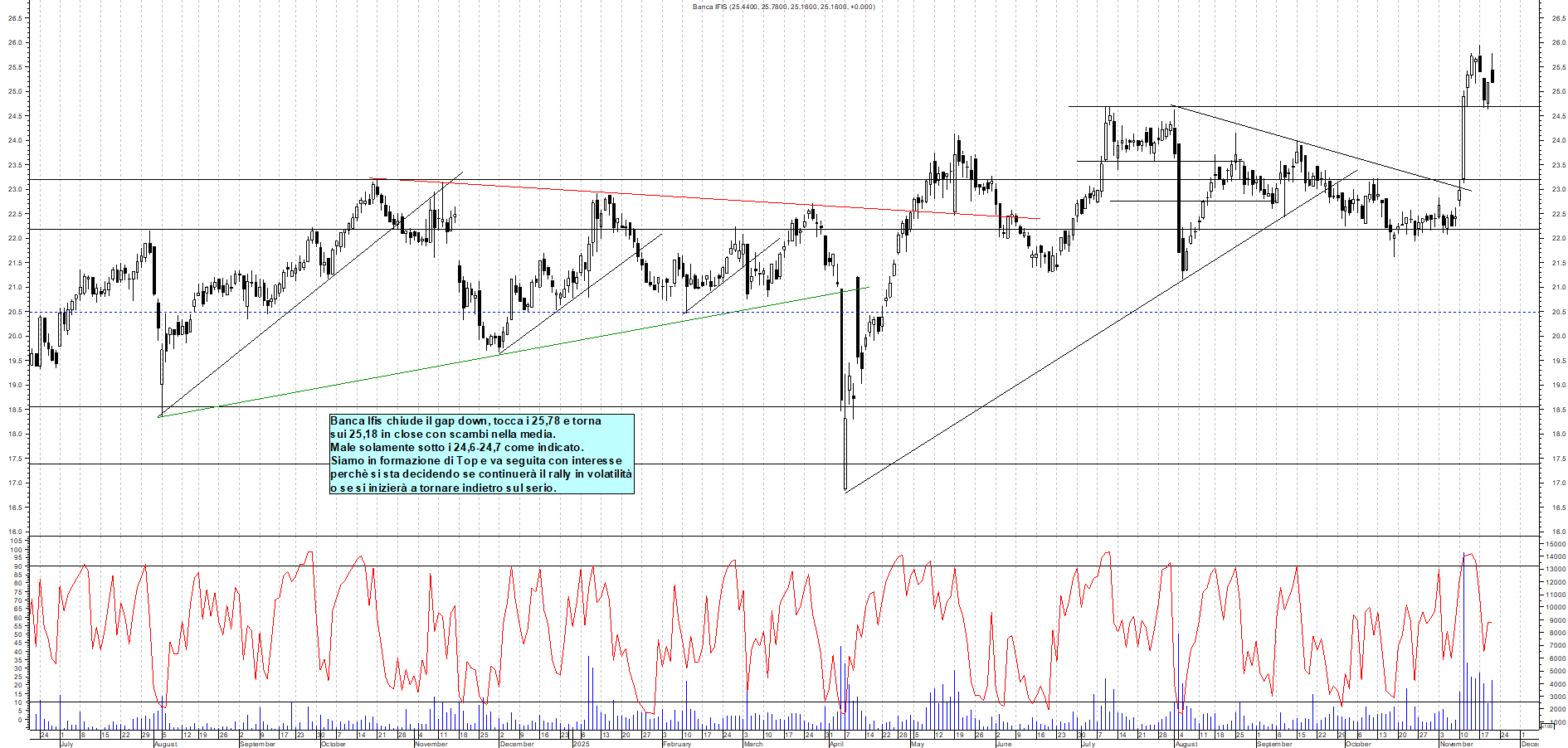 BANCA-IFIS: Banca Ifis chiude il gap down, tocca i 25,78 e torna sui 25,18 in close con scambi nella media. Male solamente sotto i 24,6-24,7 come indicato. Siamo in formazione di Top e va seguita con interesse perchè si sta decidendo se continuerà il rally in volatilità o se si inizierà a tornare indietro sul serio.
