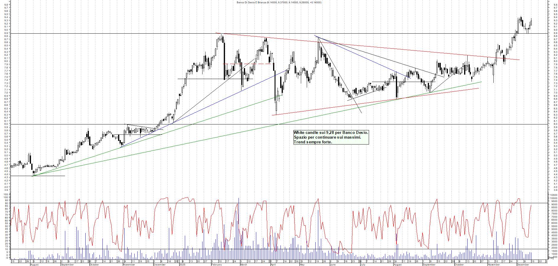 BANCO-DESIO: White candle sui 9,28 per Banco Desio. Spazio per continuare sui massimi. Trend sempre forte.
