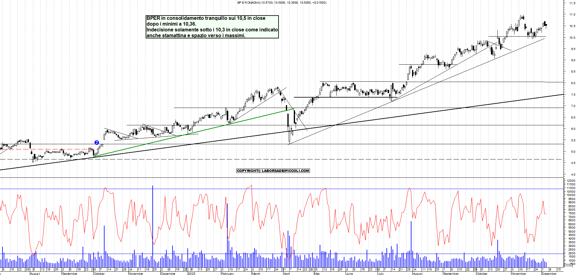 BPER: BPER in consolidamento tranquillo sui 10,5 in close dopo i minimi a 10,36. Indecisione solamente sotto i 10,3 in close come indicato anche stamattina e spazio verso i massimi.