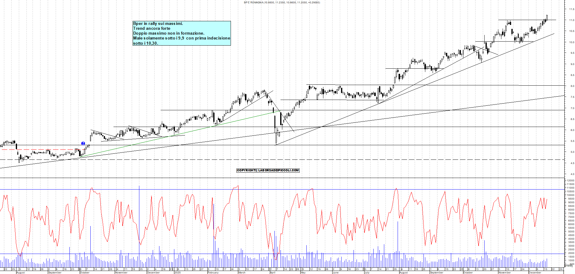 BPER: Bper in rally sui massimi. Trend ancora forte Doppio massimo non in formazione. Male solamente sotto i 9,9 con prima indecisione sotto i 10,30.