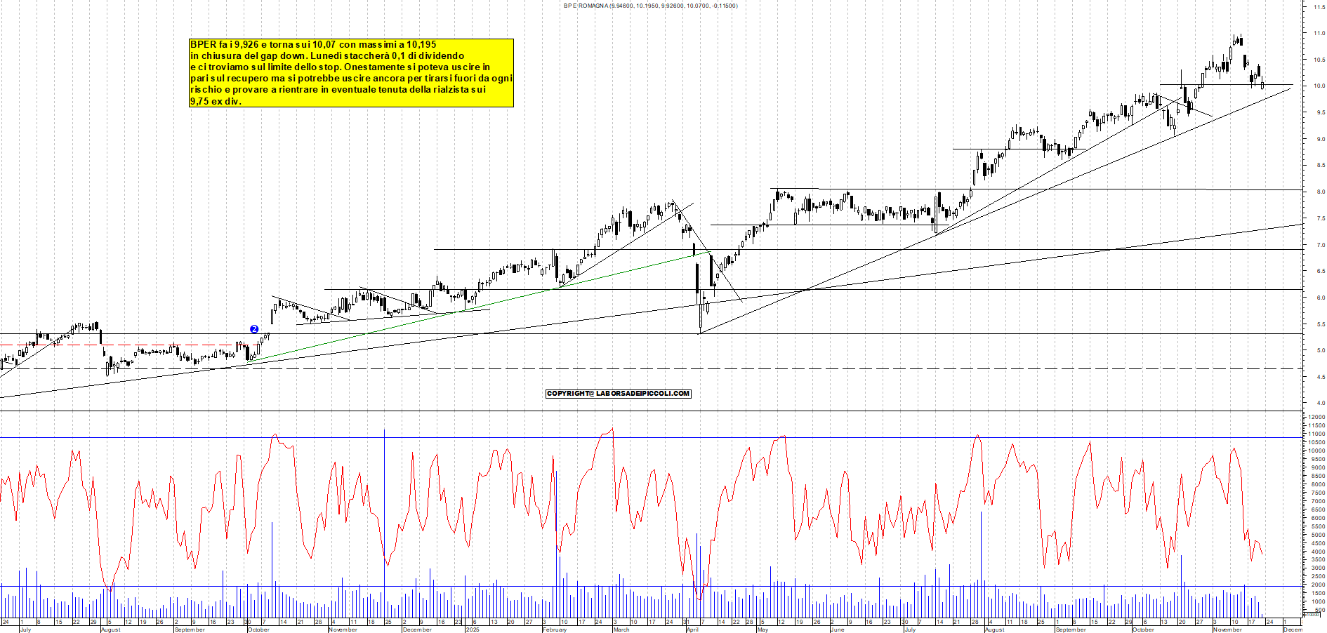BPER: BPER fa i 9,926 e torna sui 10,07 con massimi a 10,195 in chiusura del gap down. Lunedì staccherà 0,1 di dividendo e ci troviamo sul limite dello stop. Onestamente si poteva uscire in pari sul recupero ma si potrebbe uscire ancora per tirarsi fuori da ogni rischio e provare a rientrare in eventuale tenuta della rialzista sui 9,75 ex div.