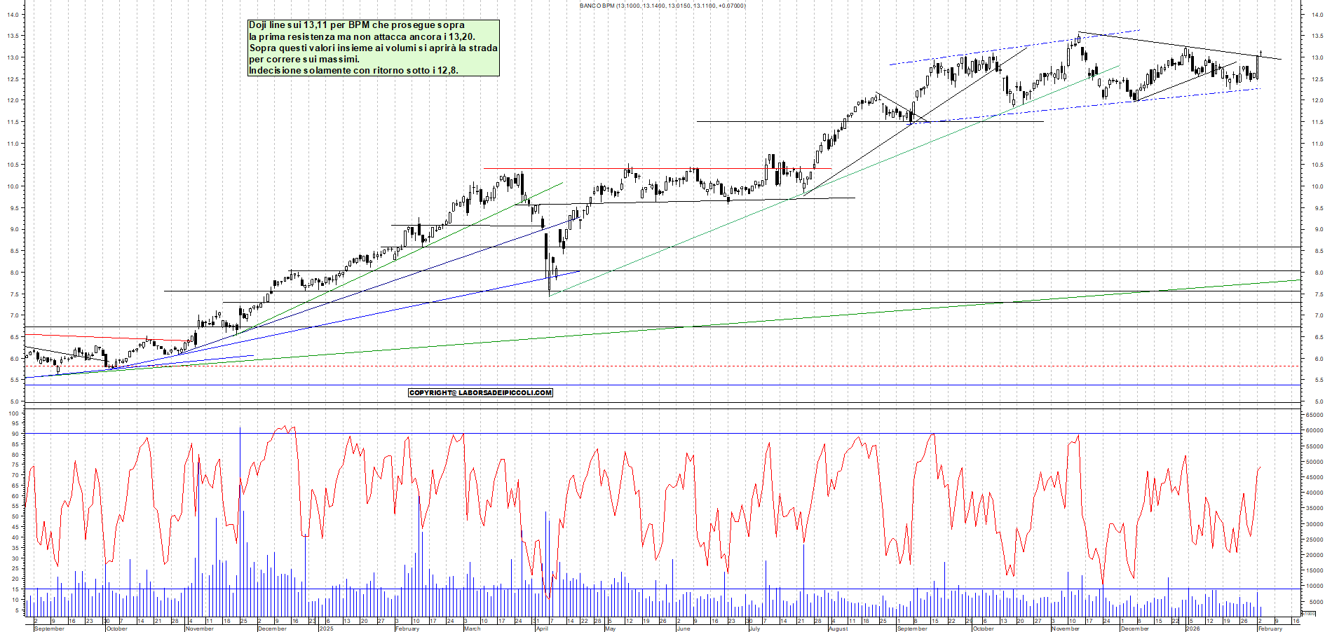 BPM: Doji line sui 13,11 per BPM che prosegue sopra la prima resistenza ma non attacca ancora i 13,20. Sopra questi valori insieme ai volumi si aprirà la strada per correre sui massimi. Indecisione solamente con ritorno sotto i 12,8.