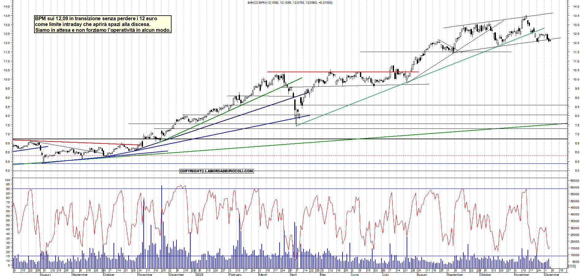 BPM: BPM sui 12,09 in transizione senza perdere i 12 euro come limite intraday che aprirà spazi alla discesa. Siamo in attesa e non forziamo l'operatività in alcun modo.