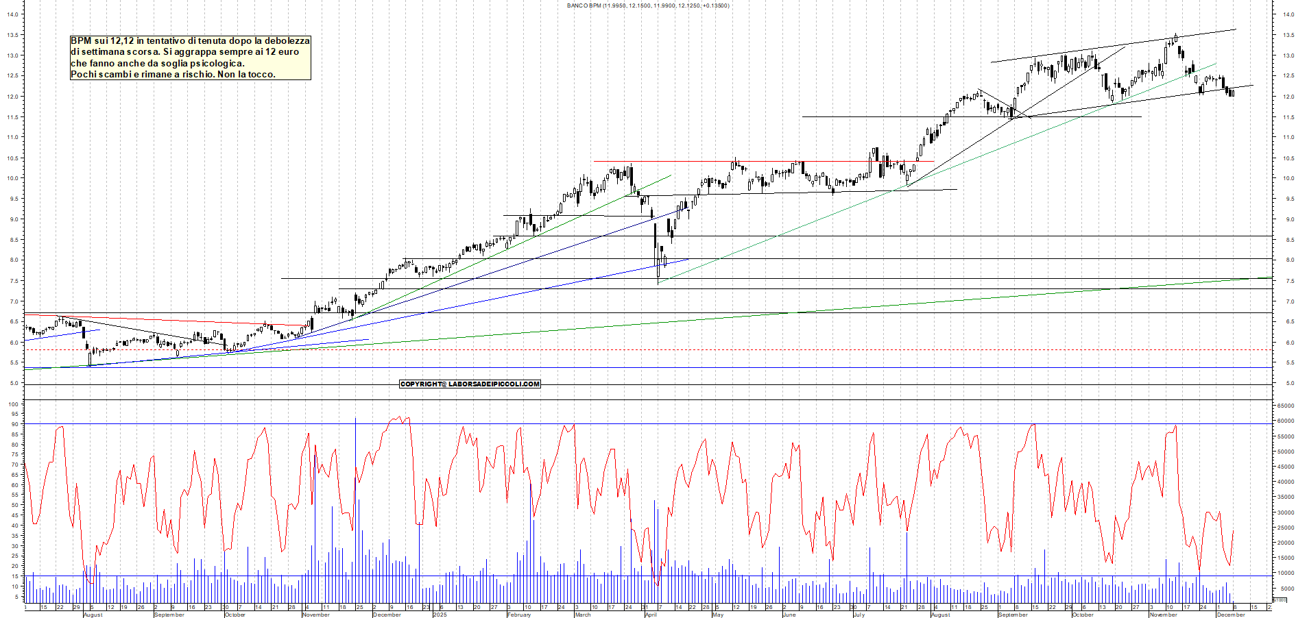 BPM: BPM sui 12,12 in tentativo di tenuta dopo la debolezza di settimana scorsa. Si aggrappa sempre ai 12 euro che fanno anche da soglia psicologica. Pochi scambi e rimane a rischio. Non la tocco.