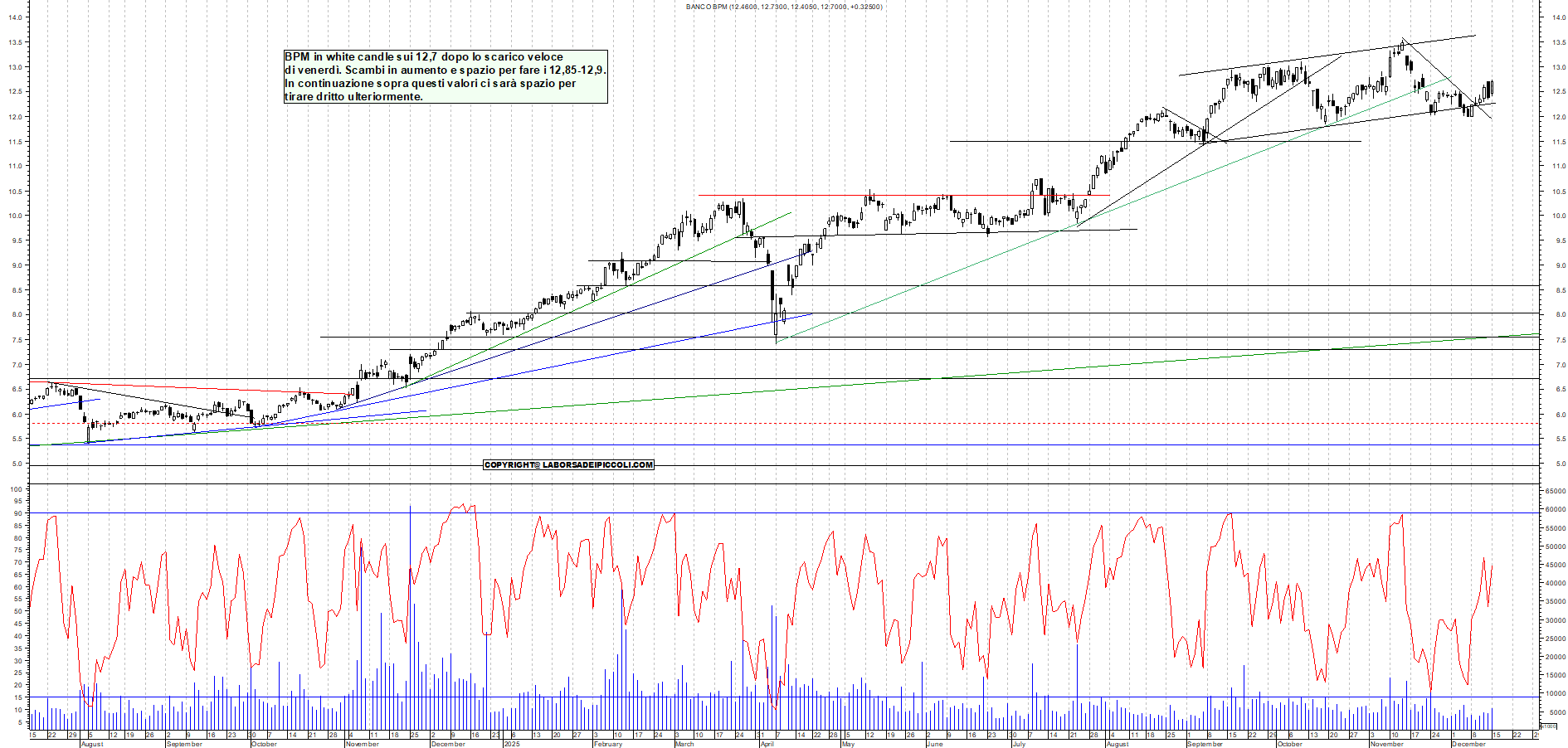 BPM: BPM in white candle sui 12,7 dopo lo scarico veloce di venerdì. Scambi in aumento e spazio per fare i 12,85-12,9. In continuazione sopra questi valori ci sarà spazio per tirare dritto ulteriormente.