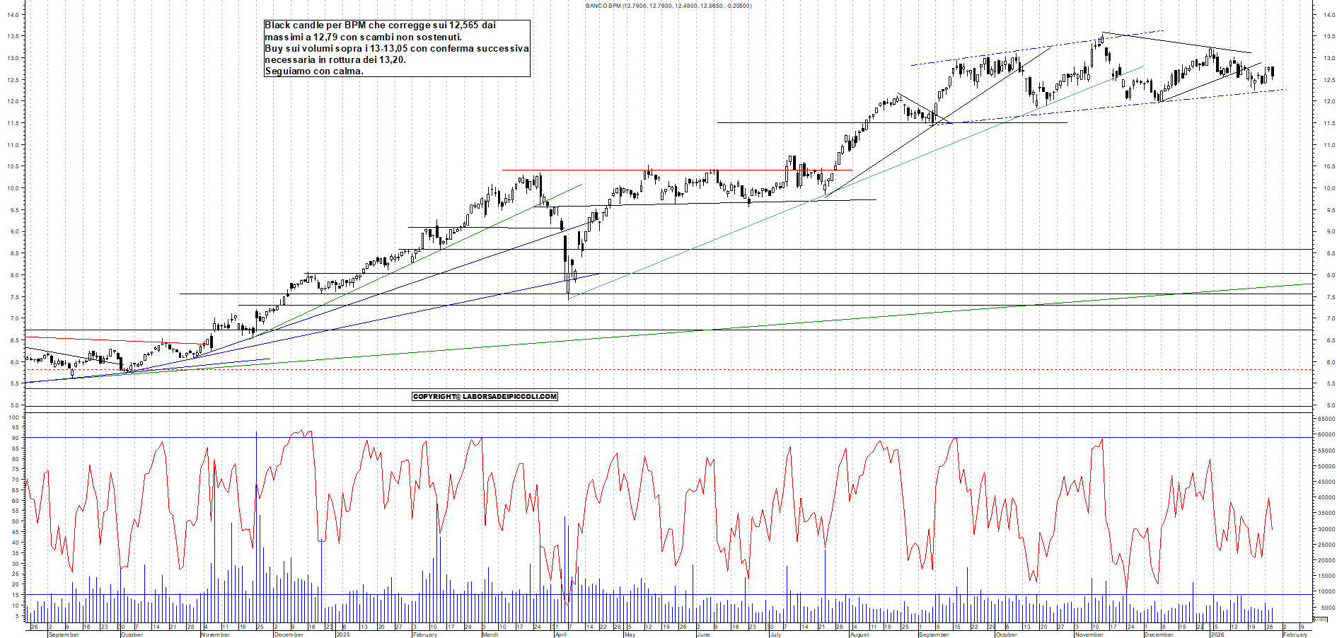 BPM: Black candle per BPM che corregge sui 12,565 dai massimi a 12,79 con scambi non sostenuti. Buy sui volumi sopra i 13-13,05 con conferma successiva necessaria in rottura dei 13,20. Seguiamo con calma.