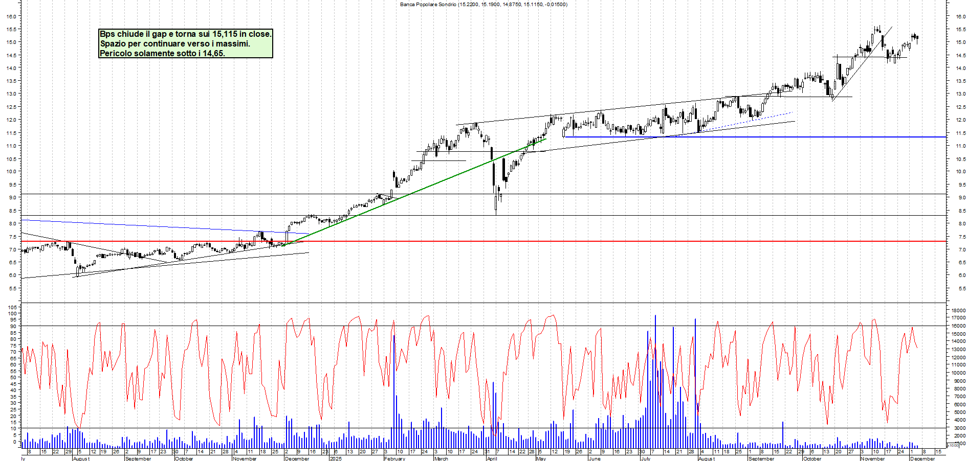 BPS: Bps chiude il gap e torna sui 15,115 in close. Spazio per continuare verso i massimi. Pericolo solamente sotto i 14,65.