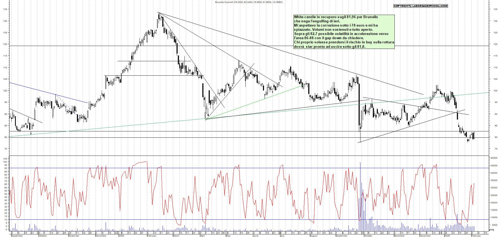 BRUNELLO: White candle in recupero sugli 81,96 per Brunello che nega l'engulfing di ieri. Mi aspettavo la correzione sotto i 78 euro e mi ha spiazzato. Volumi non sostenuti e tutto aperto. Sopra gli 82,7 possibile volatilità in accelerazione verso l'area 86-88 con il gap down da chiudere. Chi proprio volesse prendersi il rischio in buy sulla rottura dovrà star pronto ad uscire sotto gli 81,8.