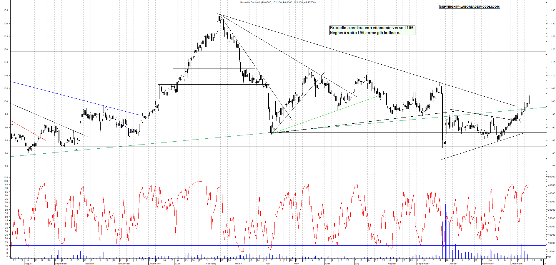 BRUNELLO: Brunello accelera correttamente verso i 106. Negherà sotto i 95 come già indicato.