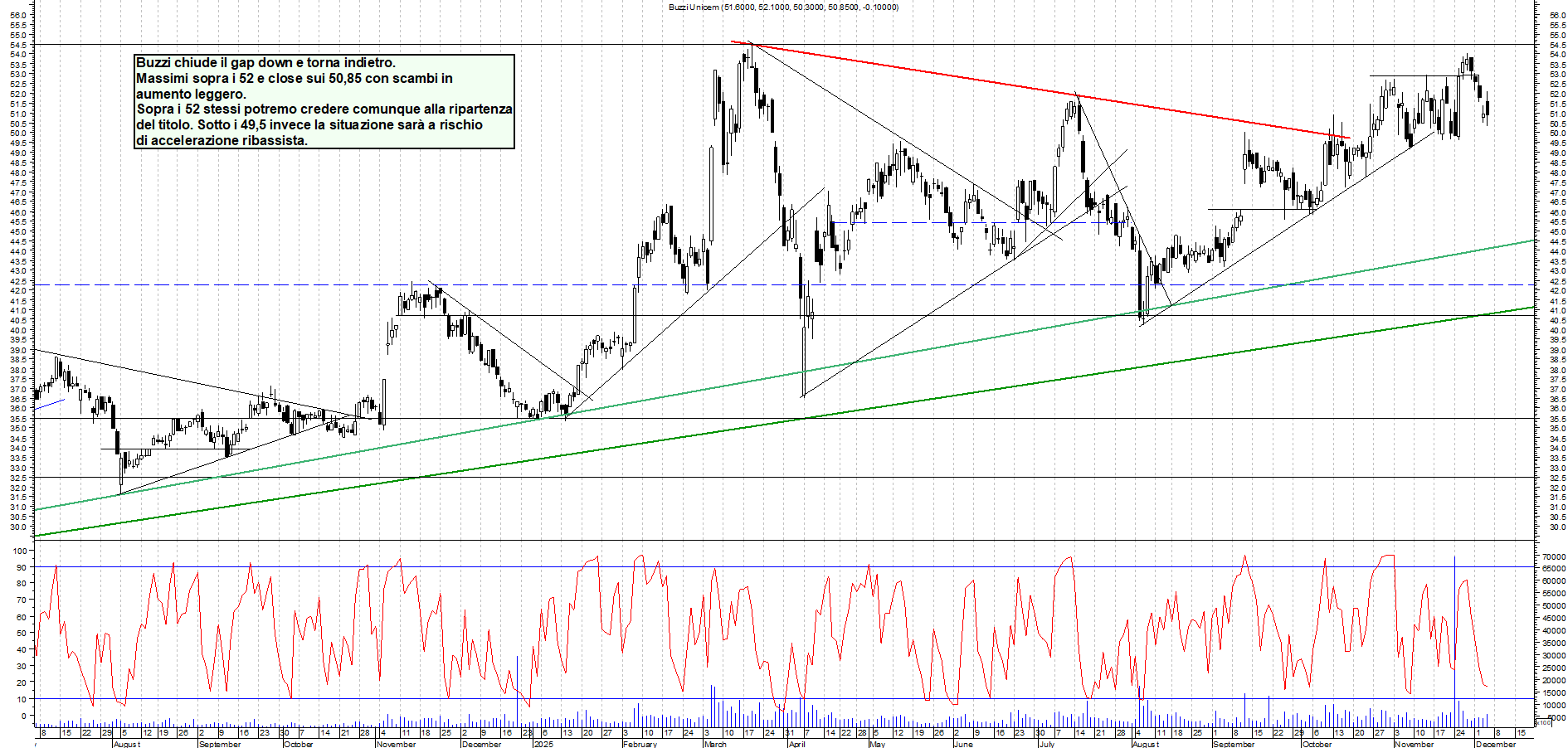 BUZZI: Buzzi chiude il gap down e torna indietro. Massimi sopra i 52 e close sui 50,85 con scambi in aumento leggero. Sopra i 52 stessi potremo credere comunque alla ripartenza del titolo. Sotto i 49,5 invece la situazione sarà a rischio di accelerazione ribassista.