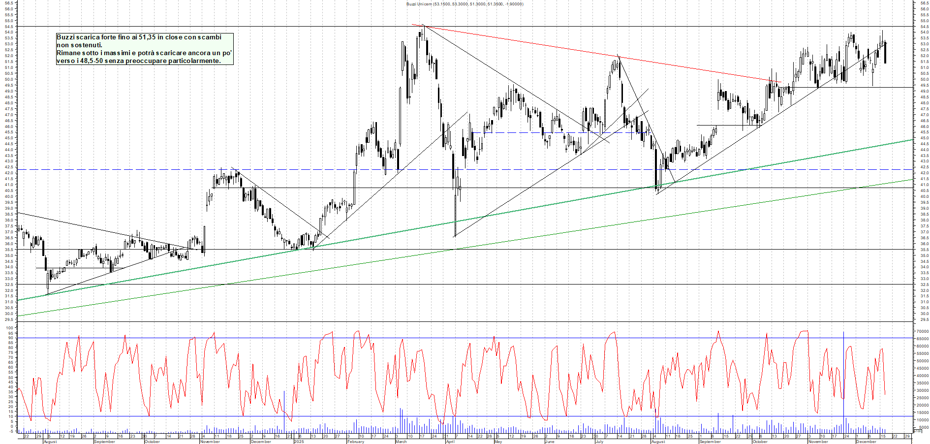 BUZZI: Buzzi scarica forte fino ai 51,35 in close con scambi non sostenuti. Rimane sotto i massimi e potrà scaricare ancora un po' verso i 48,5-50 senza preoccupare particolarmente.