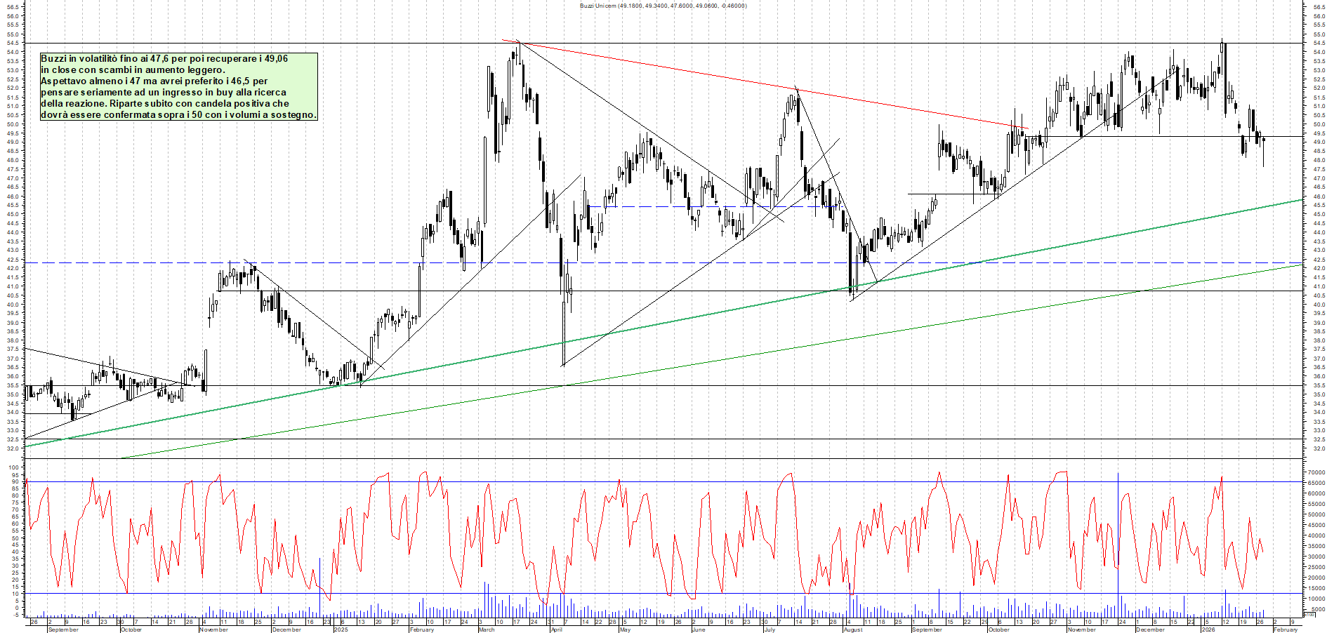 BUZZI: Buzzi in volatilitò fino ai 47,6 per poi recuperare i 49,06 in close con scambi in aumento leggero. Aspettavo almeno i 47 ma avrei preferito i 46,5 per pensare seriamente ad un ingresso in buy alla ricerca della reazione. Riparte subito con candela positiva che dovrà essere confermata sopra i 50 con i volumi a sostegno.