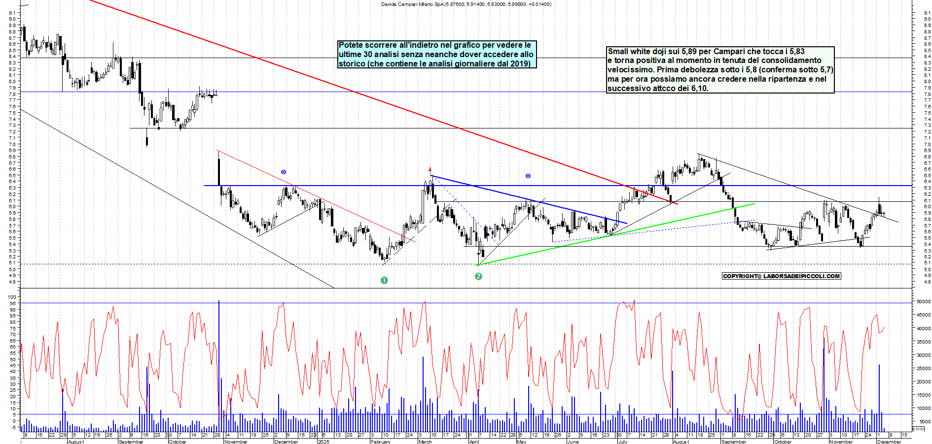 CAMPARI: Small white doji sui 5,89 per Campari che tocca i 5,83 e torna positiva al momento in tenuta del consolidamento velocissimo. Prima debolezza sotto i 5,8 (conferma sotto 5,7) ma per ora possiamo ancora credere nella ripartenza e nel successivo attcco dei 6,10.