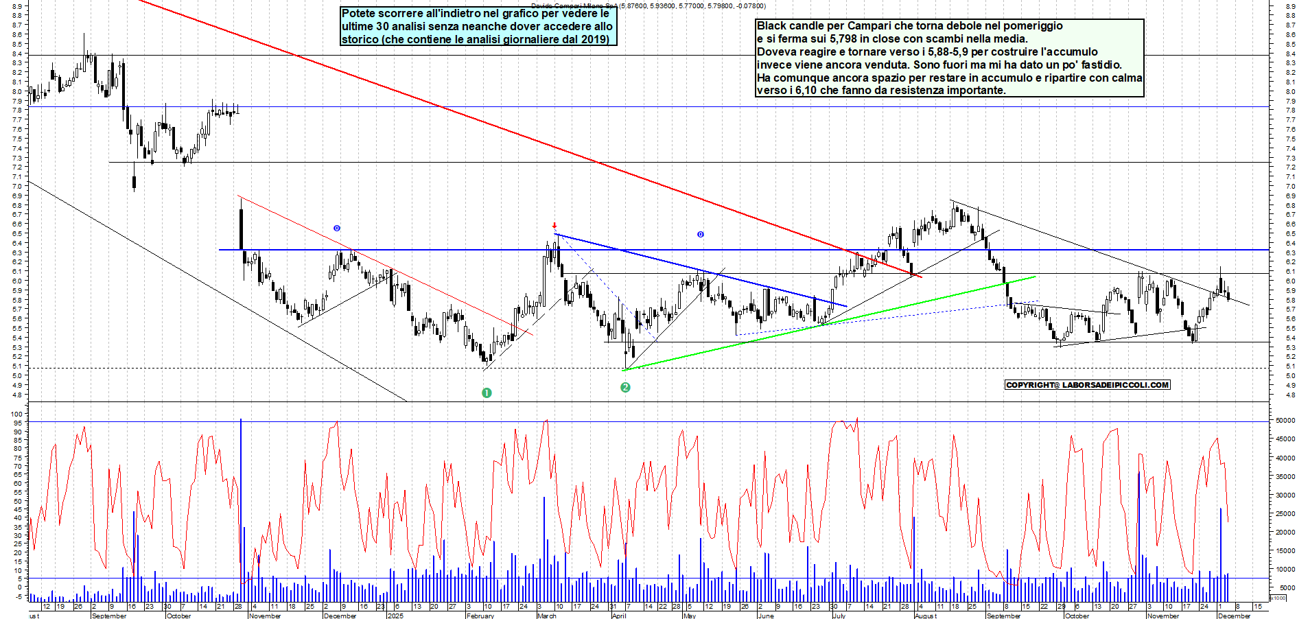 CAMPARI: Black candle per Campari che torna debole nel pomeriggio e si ferma sui 5,798 in close con scambi nella media. Doveva reagire e tornare verso i 5,88-5,9 per costruire l'accumulo invece viene ancora venduta. Sono fuori ma mi ha dato un po' fastidio. Ha comunque ancora spazio per restare in accumulo e ripartire con calma verso i 6,10 che fanno da resistenza importante.