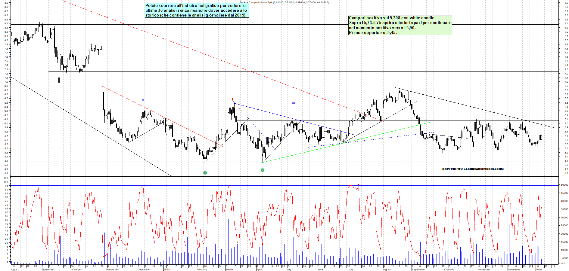 CAMPARI: Campari positiva sui 5,708 con white candle. Sopra i 5,73-5,75 aprirà ulteriori spazi per continuare nel momento positivo verso i 5,90. Primo supporto sui 5,45.📊 Livelli OperativiSupporti:5,45->5,35€Resistenze:5,75->5,90€➔ Analisi completa CAMPARI con strategia operativa