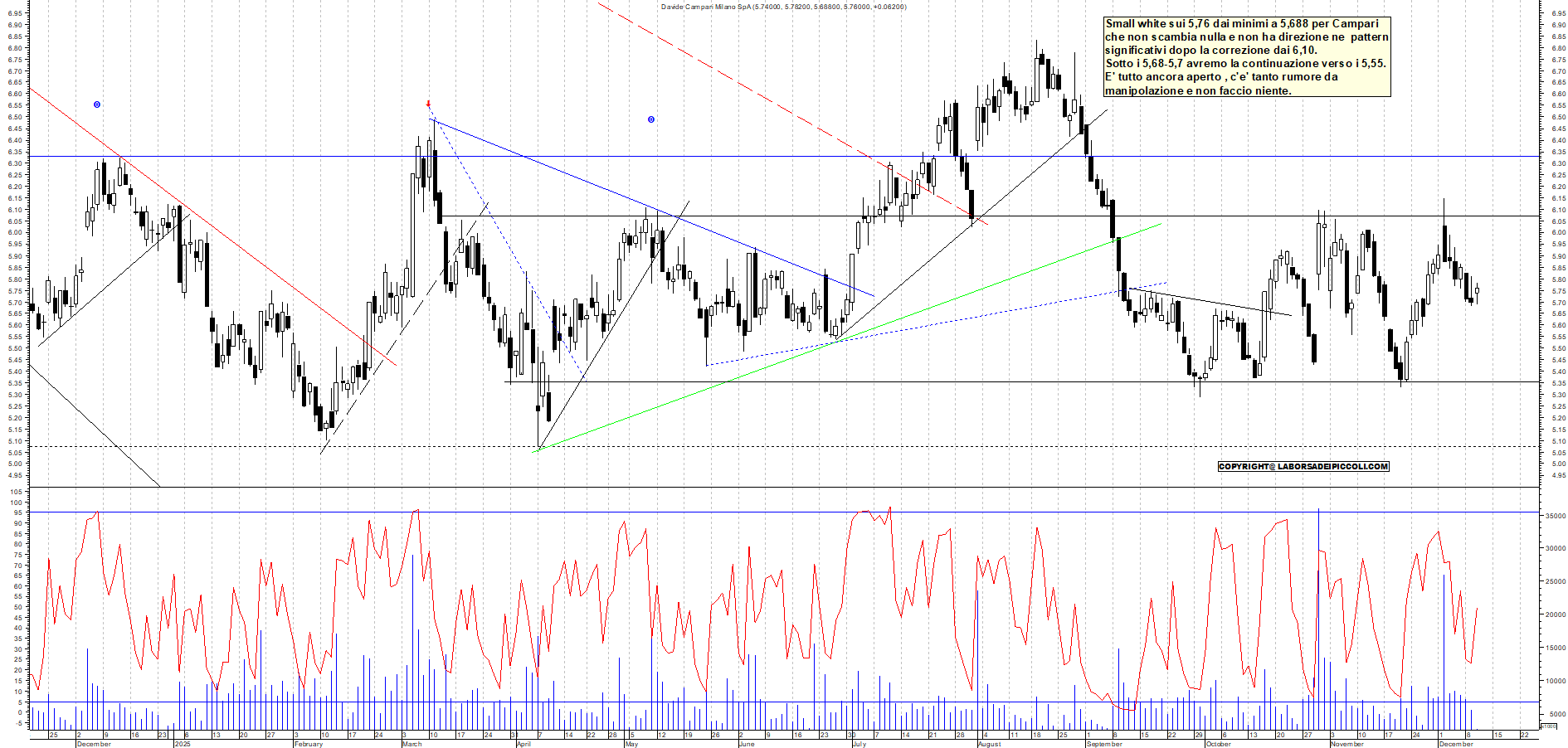 CAMPARI: Small white sui 5,76 dai minimi a 5,688 per Campari che non scambia nulla e non ha direzione ne pattern significativi dopo la correzione dai 6,10. Sotto i 5,68-5,7 avremo la continuazione verso i 5,55. E' tutto ancora aperto , c'e' tanto rumore da manipolazione e non faccio niente.