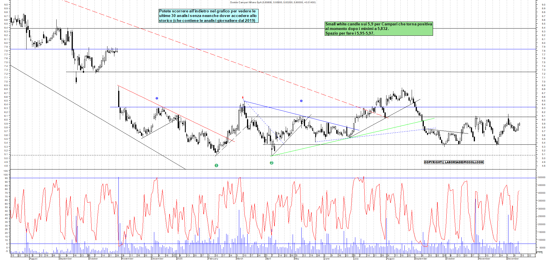 CAMPARI: Small white candle sui 5,9 per Campari che torna positiva al momento dopo i minimi a 5,832. Spazio per fare i 5,95-5,97.