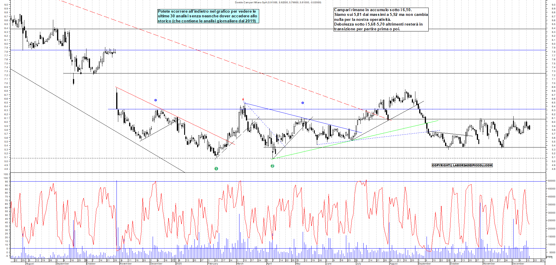 CAMPARI: Campari rimane in accumulo sotto i 6,10. Siamo sui 5,81 dai massimi a 5,92 ma non cambia nulla per la nostra operatività. Debolezza sotto i 5,68-5,70 altrimenti resterà in transizione per partire prima o poi.