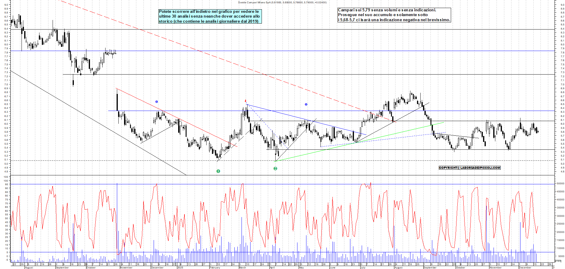 CAMPARI: Campari sui 5,79 senza volumi e senza indicazioni. Prosegue nel suo accumulo e solamente sotto i 5,68-5,7 ci isarà una indicazione negativa nel brevissimo.
