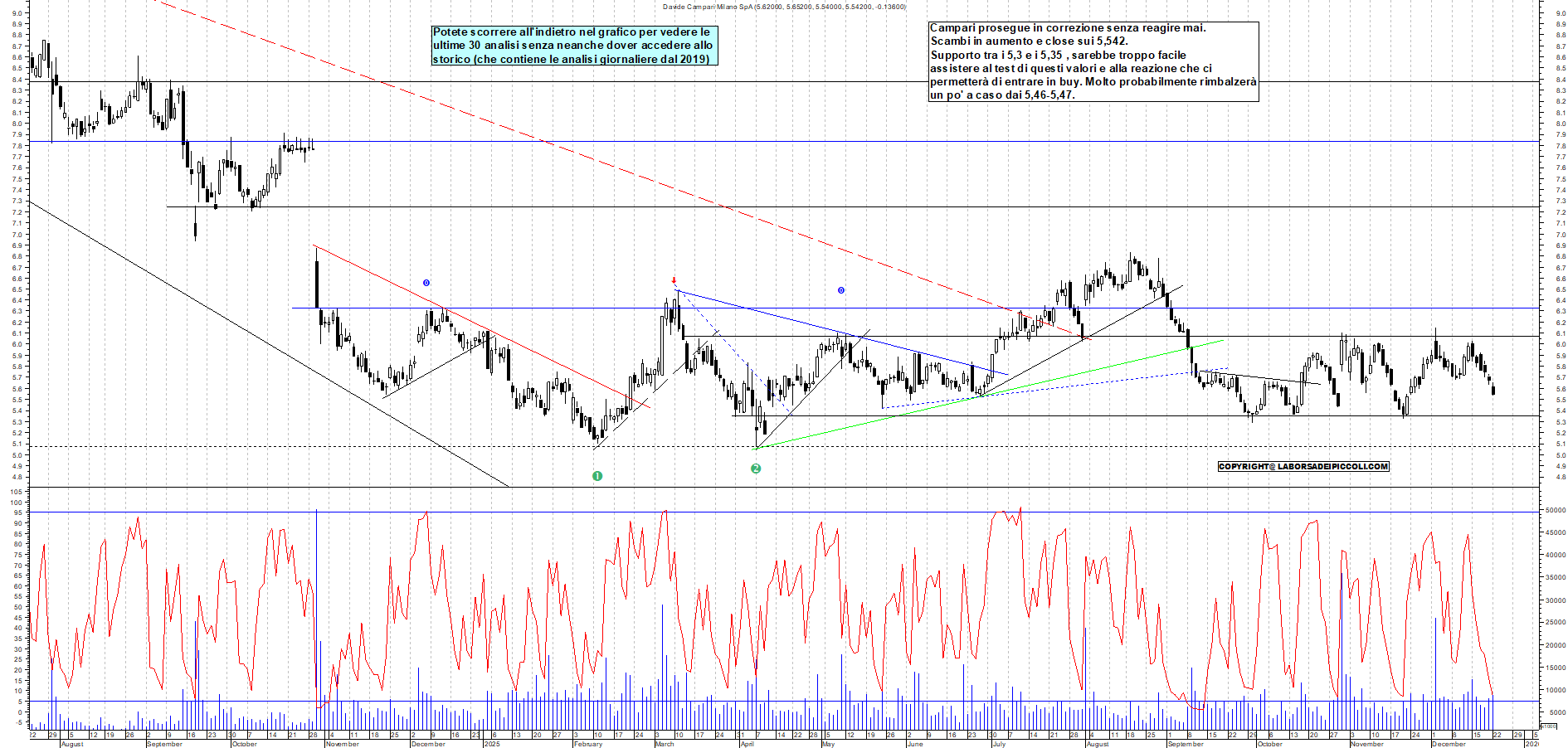 CAMPARI: Campari prosegue in correzione senza reagire mai. Scambi in aumento e close sui 5,542. Supporto tra i 5,3 e i 5,35 , sarebbe troppo facile assistere al test di questi valori e alla reazione che ci permetterà di entrare in buy. Molto probabilmente rimbalzerà un po' a caso dai 5,46-5,47.