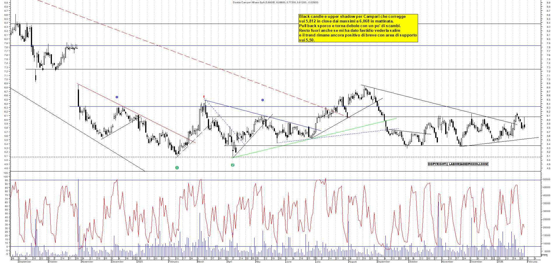 CAMPARI: Black candle e upper shadow per Campari che corregge sui 5,812 in close dai massimi a 6,068 in mattinata. Pull back sporco e torna debole con un po' di scambi. Resto fuori anche se mi ha dato fastidio vederla salire e il trend rimane ancora positivo di breve con area di supporto sui 5,50.