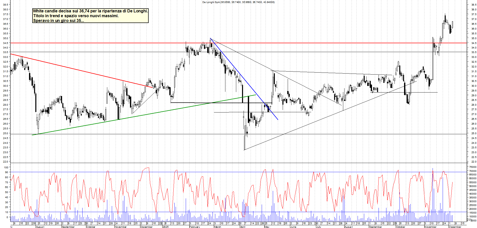 DE-LONGHI: White candle decisa sui 36,74 per la ripartenza di De Longhi. Titolo in trend e spazio verso nuovi massimi. Speravo in un giro sui 35...