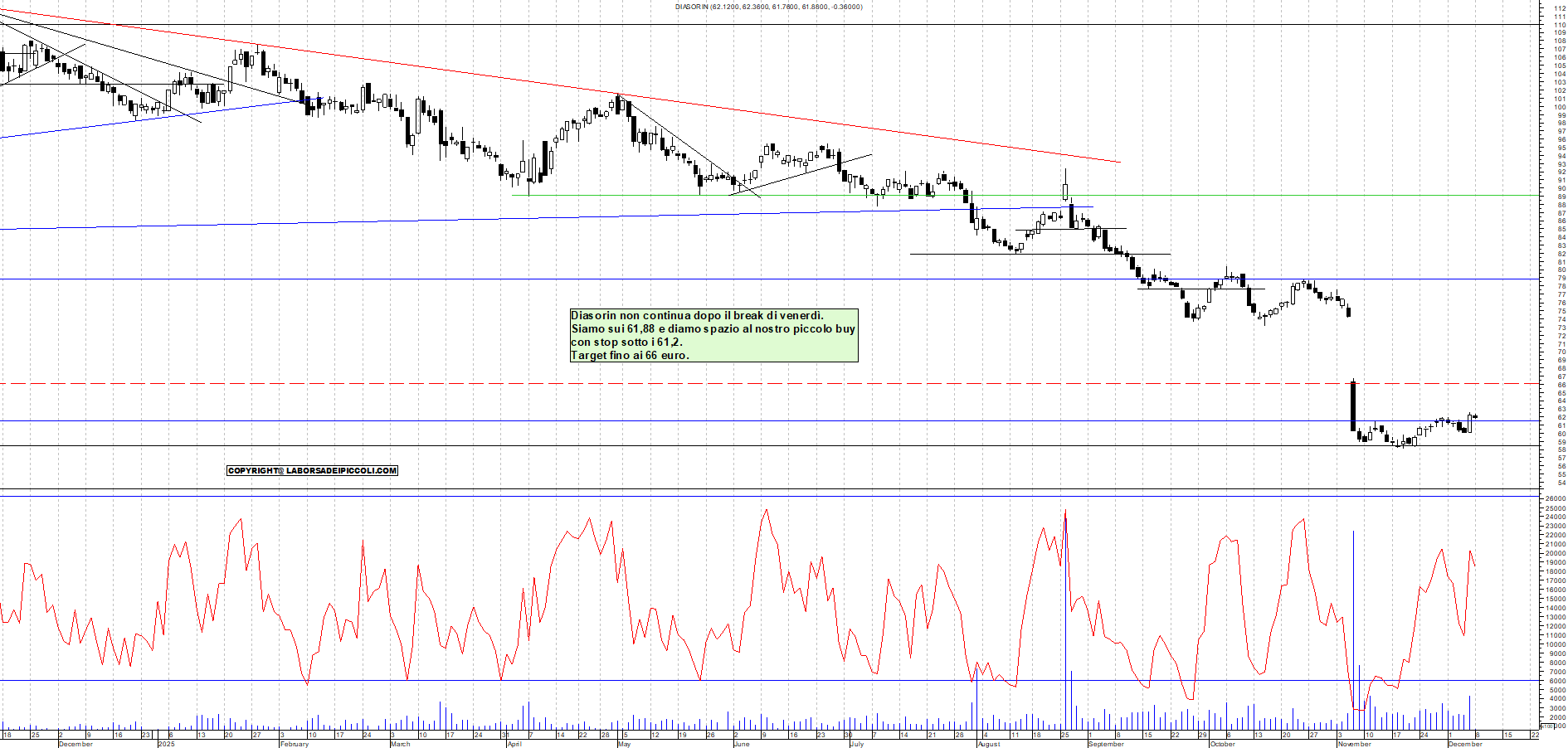 DIASORIN: Diasorin non continua dopo il break di venerdì. Siamo sui 61,88 e diamo spazio al nostro piccolo buy con stop sotto i 61,2. Target fino ai 66 euro.
