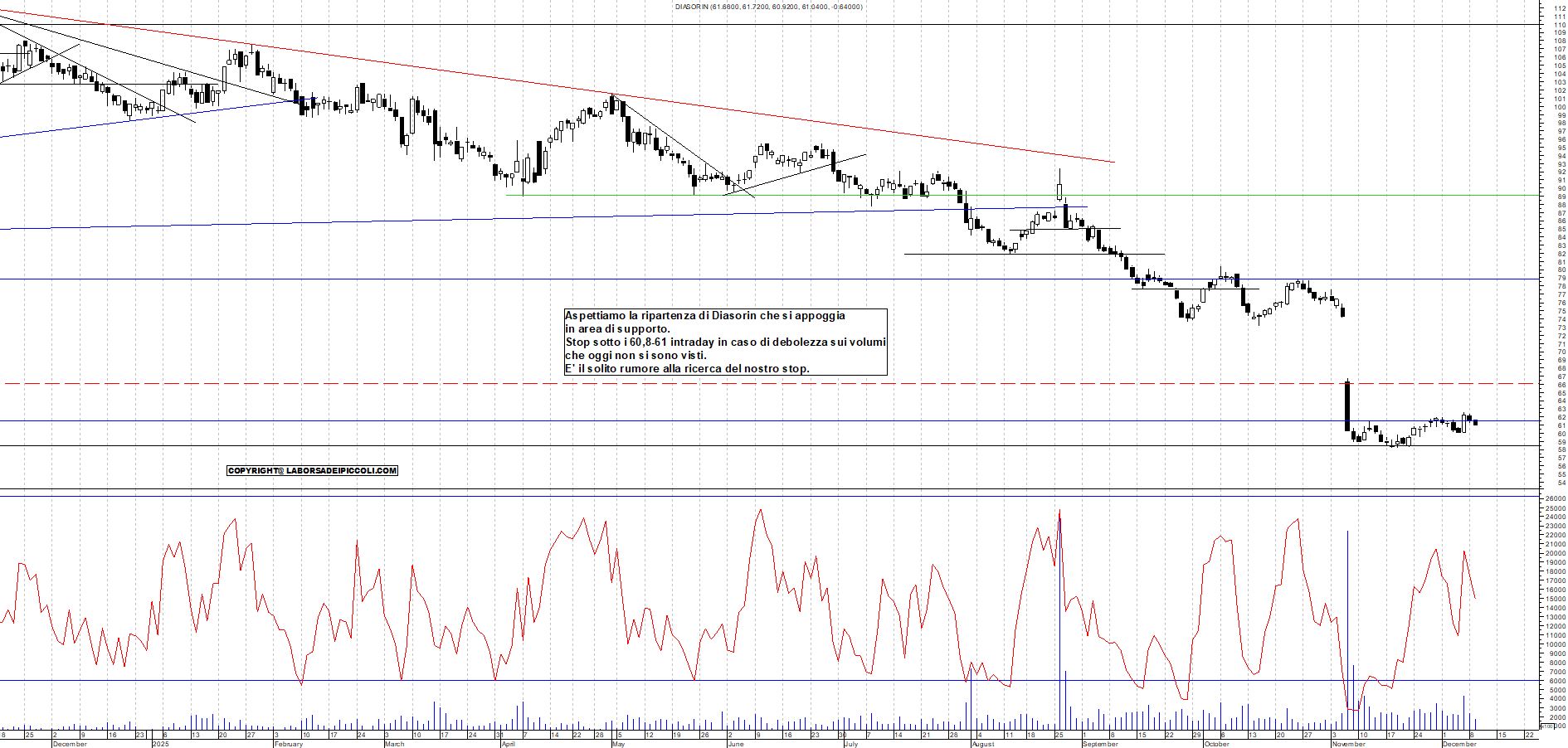 DIASORIN: Aspettiamo la ripartenza di Diasorin che si appoggia in area di supporto. Stop sotto i 60,8-61 intraday in caso di debolezza sui volumi che oggi non si sono visti. E' il solito rumore alla ricerca del nostro stop.