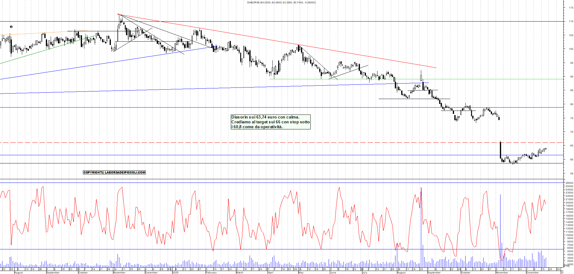 DIASORIN: Diasorin sui 63,74 euro con calma. Crediamo al target sui 66 con stop sotto i 60,8 come da operatività.